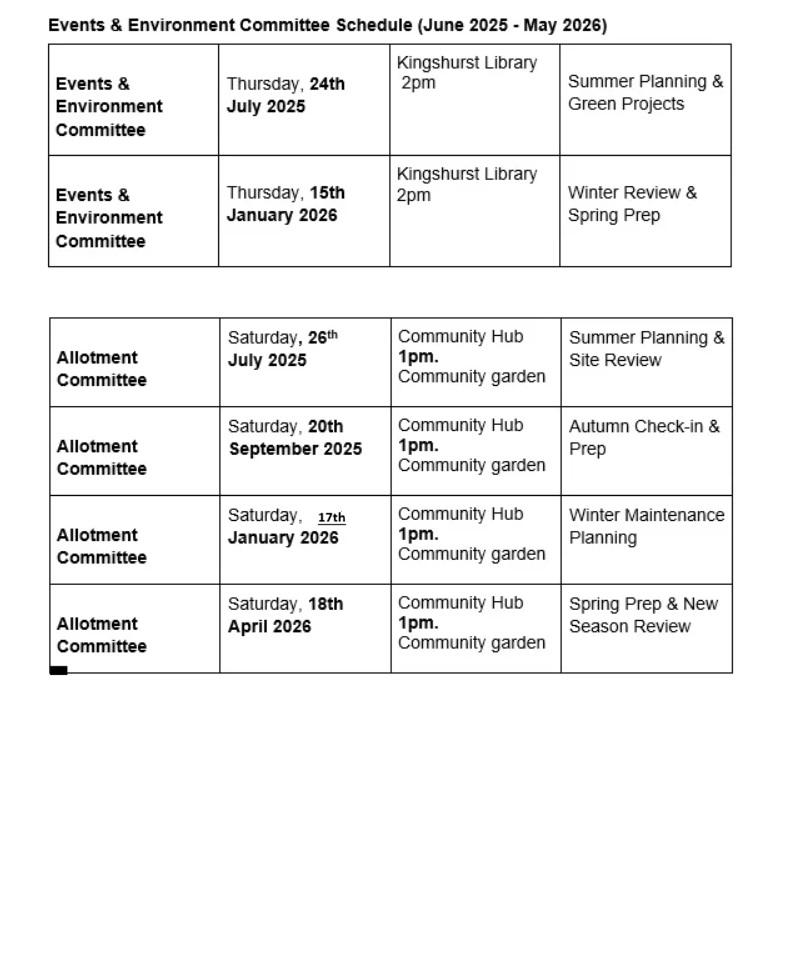 Full meetings of the Council are held 5 times a year (on the 2nd Thursday in the month), except August at such premises that the Council may direct. Usually held at The Seeds of Hope, Overgreen Drive, Kingshurst, B37 6EY).